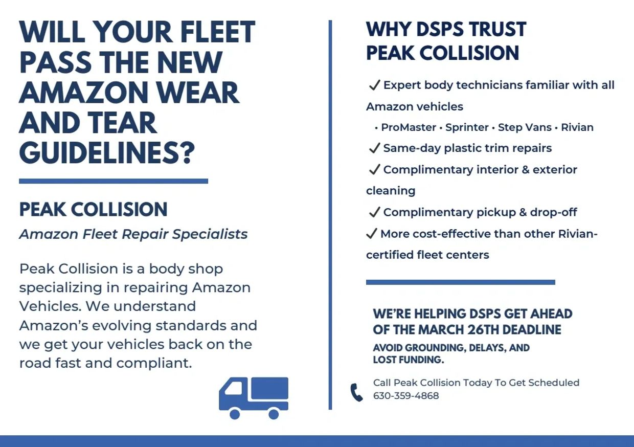 Peak Collision delivers expert auto body repair for personal vehicles and Amazon DSP fleets. We help you stay compliant, minimize downtime, and get back on the road fast.
